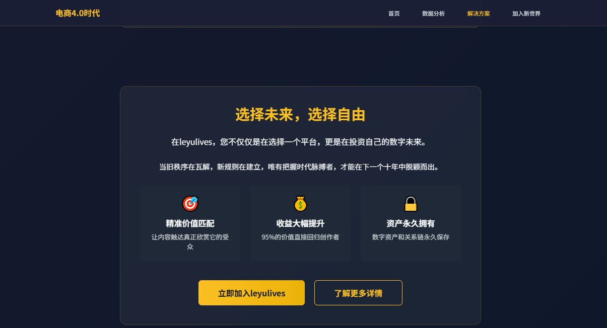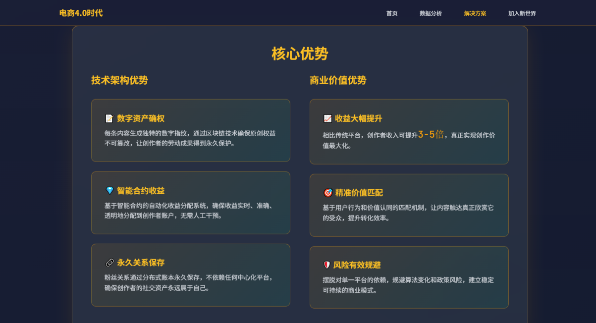 "现在的电商行业,传统的"流量+低价"玩法已经走到了尽头,增长见顶、利润微薄,而新的机会正在Web3.0的世界里悄然萌芽。当大部分人还在旧赛道里为了几毛钱的利润拼得头破血流,为了一点点流量费尽心机的时候,已经有聪明的商家转身拥抱了新世界,并且尝到了甜头。