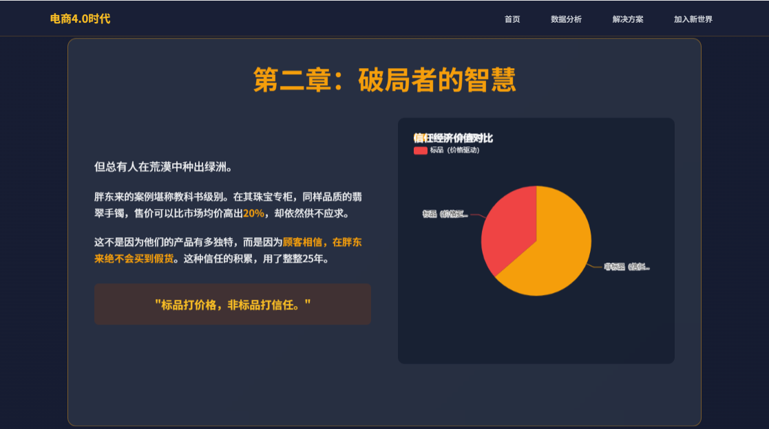 这给陷入困局的电商人指出了一个明确的转型方向:从“流量思维”转向“用户思维”,从“交易关系”转向“信任关系”。标品拼价格,非标品拼信任。未来,所有产品都可以通过附加情感、故事和专业服务,使其“非标品化”,从而构建自己的护城河。