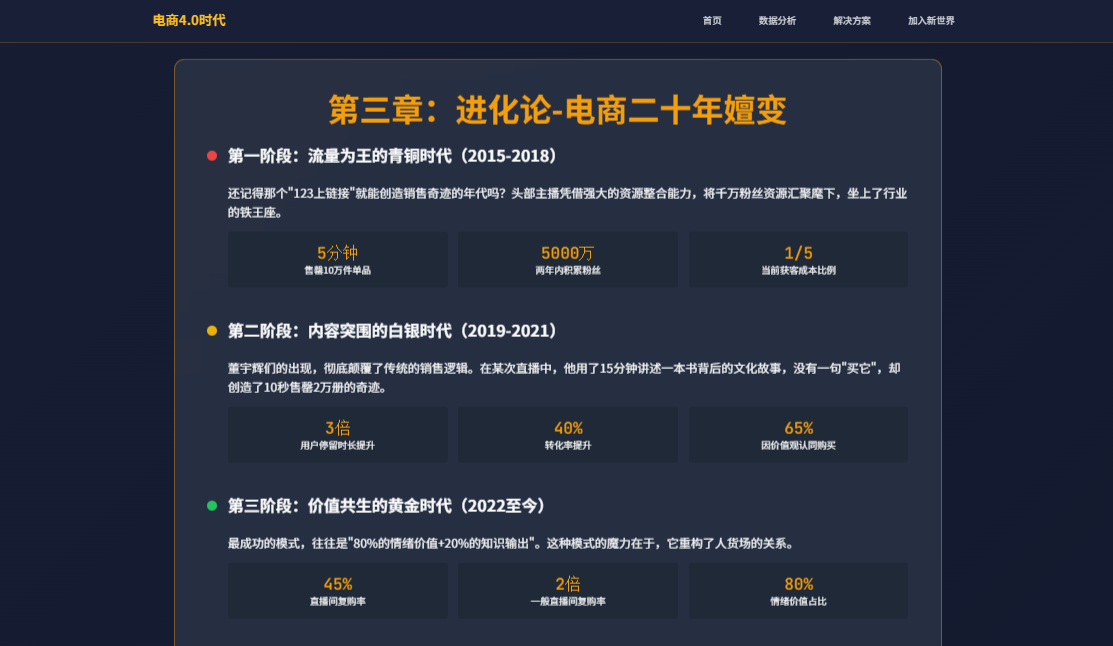 这个进化路径揭示了消费需求的升级:从对“物”的需求(便宜),到对“文”的需求(内容、故事),再到对“心”的需求(情感共鸣、自我实现)。成功的商家必须是这个需求的洞察者和满足者。